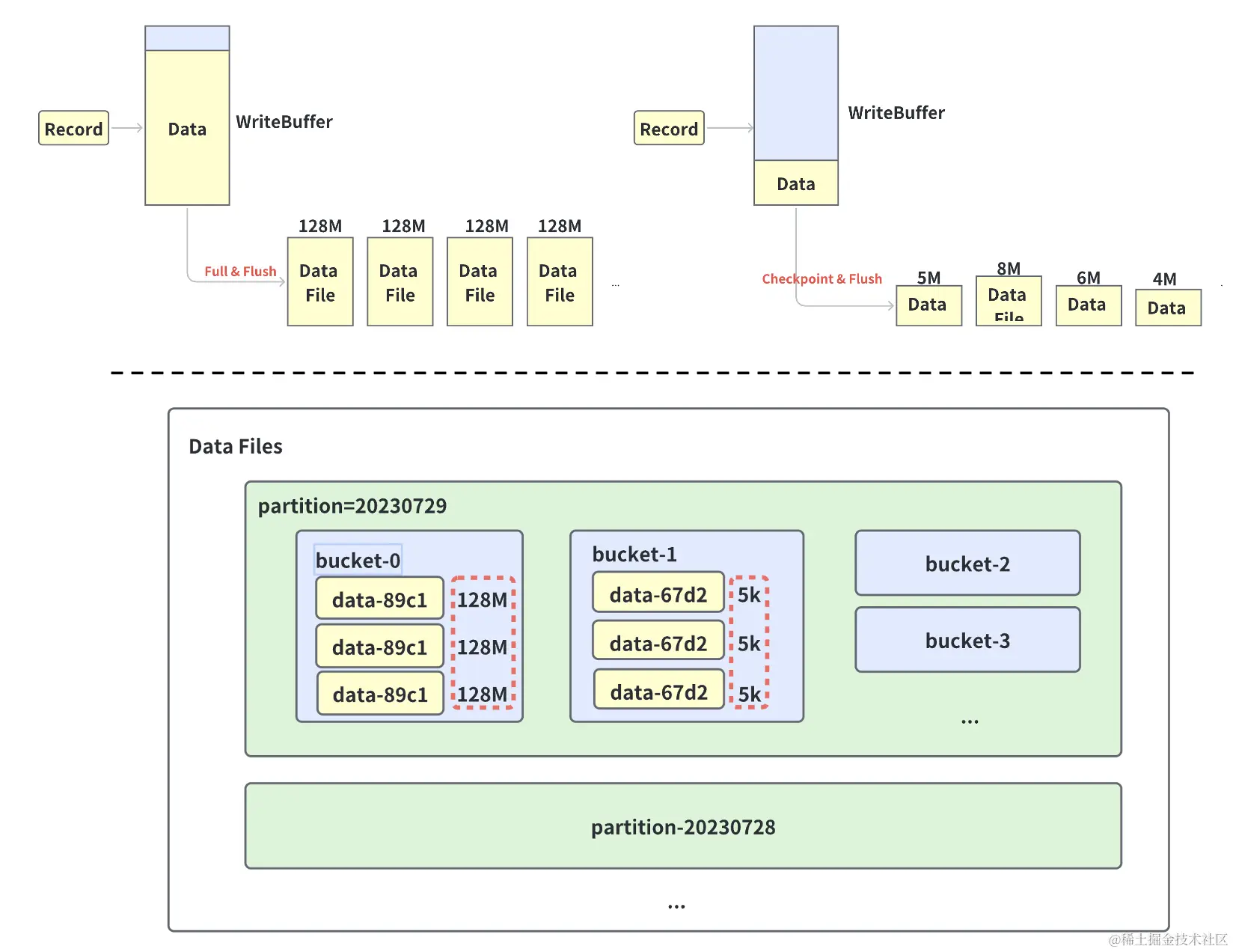 文件生成。数据文件在磁盘上生成是有两个触发时机的,一个是 Checkpoint 的时候,它会强制把当前的 WriteBuffer 里的数据刷到磁盘上;第二个是 WriteBuffer,当它满了也会把内存里面的数据刷到磁盘上。如果把 Checkpoint Interval 调的过小,或是把 WriteBuffer 容量设置的比较小,那么数据就会更频繁的被刷到磁盘上,而产生过量的小文件。