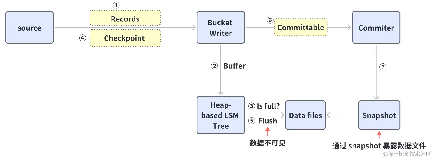 首先要分析下整个链路数据的可见性与什么相关。如上图所示,Source 在收到数据之后,会把这些 Records 源源不断的发给 Bucket,然后 Bucket Writer 在收到数据后,先把这些数据缓存到一个基于内存的 Buffer,存满之后会触发一个 Flash 将这个 Buffer 里的数据全部都 Flash 到磁盘上。这个时候就生成了对外不可见的数据文件,只有当上游触发了一个 Checkpoint 的时候,整个链路中 Commit 算子生成一个 Snapshot 指向刚生成的数据文件才能对外可见。