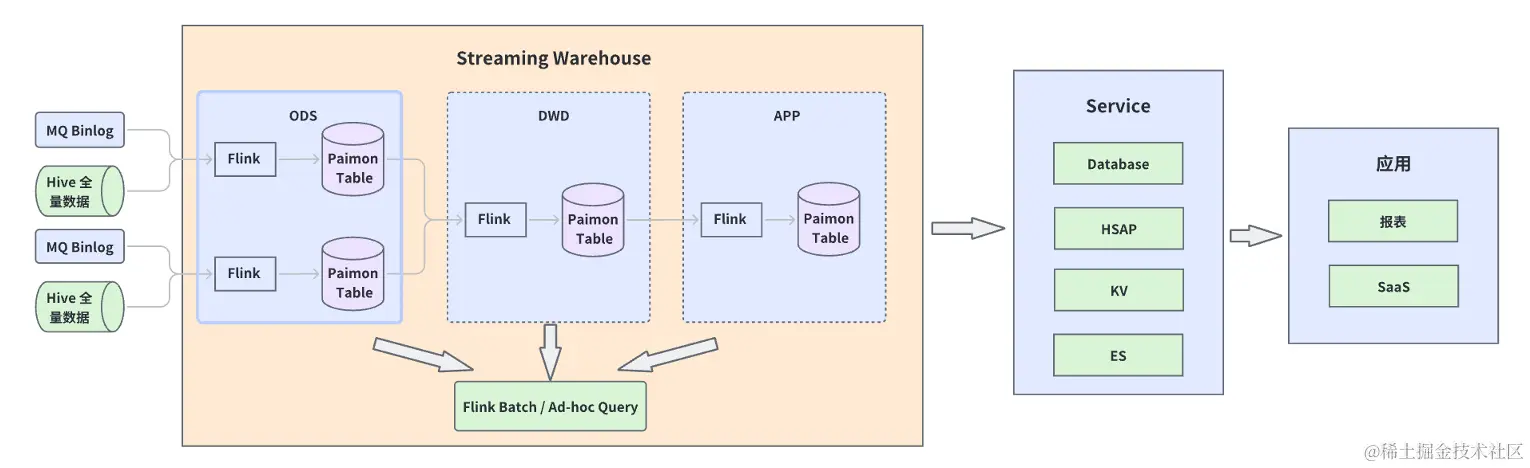 上图是流式数仓 Pipeline。数据源和前面提到的一样,离线数据存在 Hive 中,实时数据存在 MQ 中。不同的是在进入 Streaming Lakehouse 的时候,设置了一个 ODS 层,这层会通过 Flink Streaming SQL 把每一个数据源沉淀到 Paimon Table 里。第二层是 DWD 层,通过对多个数据源进行 Join 打宽的操作,将输出的结果沉淀到 Paimon Table 里。再通过最后一层 APP 层做指标聚合以及透出的工作。