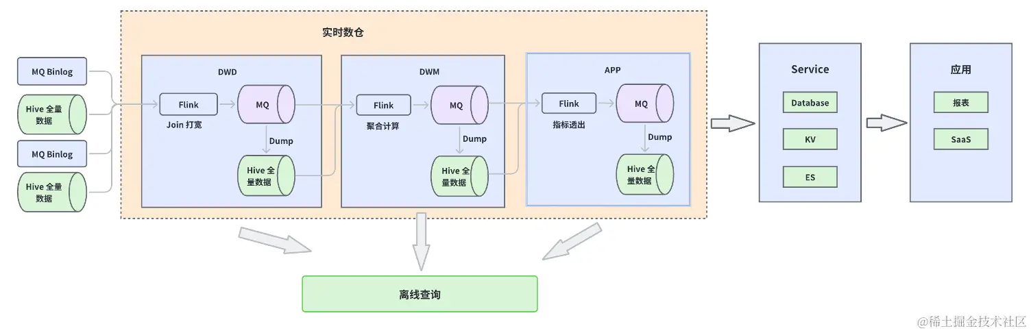 上图实时数仓中的每一层都是由一个 Flink Streaming SQL 串联起来的,DW 层的主要功能是把多个数据源进行 Join 打宽,通过计算出来的宽表实现直接输出进 MQ 中。由于 MQ 的留存时间有限会形成一个小时级或天级的周期性任务,在一个周期结束后 MQ 中的数据最终会落到 Hive 里。DWM 这一层主要的作用是聚合计算,聚合计算的结果也会直接输出到 MQ 中。每一层的计算模式都和上一层相同,实时数仓的计算结果会通过 Service 层服务于在线的数据应用,比如上面提到的数据报表和考核系统。每层输出的 Hive 离线数据可以用于 BP 同学做数据排查/验证等离线查询工作。