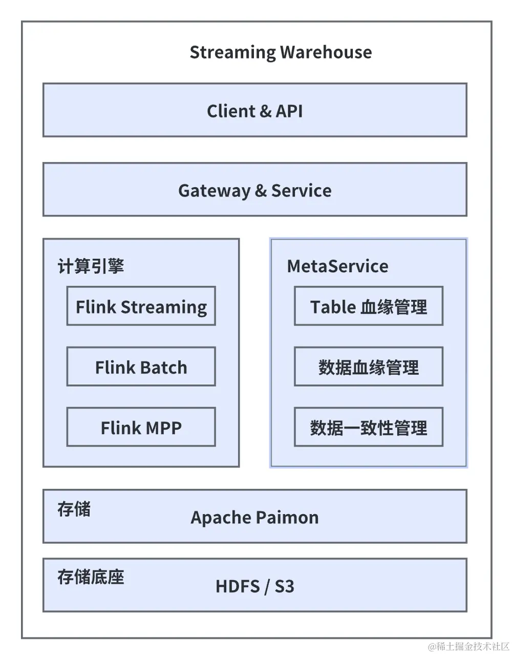 如上图可见上层通过 Gateway 或 Service 层对外提供服务,最终用户通过 SQL Client 或是 Rest API 访问整个系统。