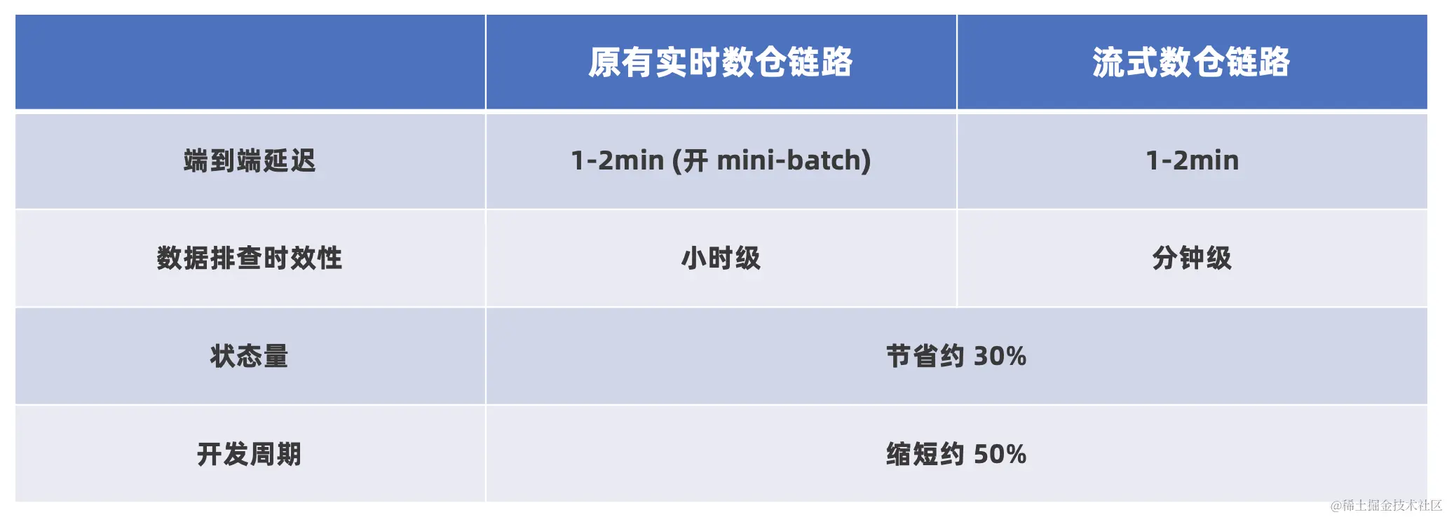 数据新鲜度差:端到端的延迟变化为分钟级,数据新鲜度降低;