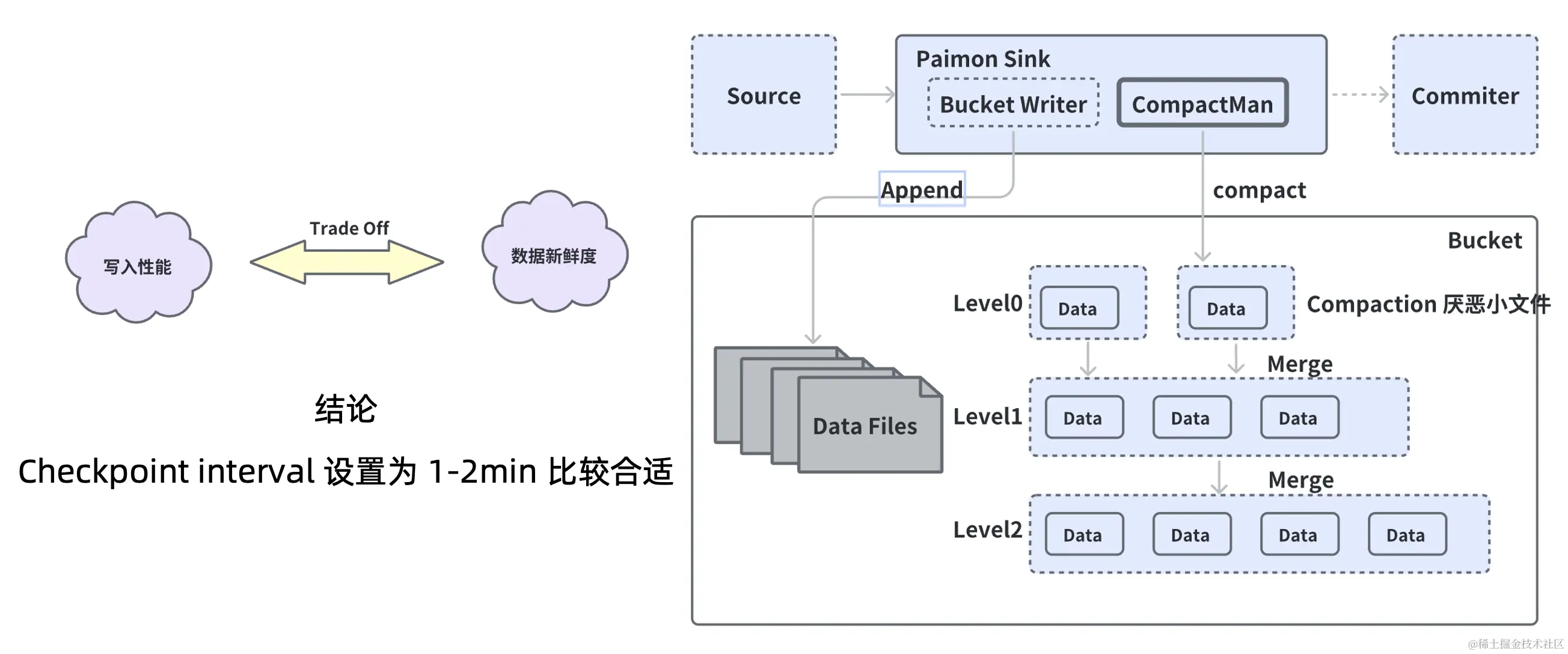 所以我们推断,整个 Compaction 过程是一个 I/O 比较多的操作过程,假设一味的调小 Checkpoint Interval,会导致频繁的 Checkpoint,比如原来 100 条数据本来是能分一个文件里的,但是现在 Checkpoint 频率过高后,这 100 条数据可能会被分到多个文件里,那么每个文件里面的数据都会很小。其次,小文件过多,会让 Compaction 的整体代价变得更高,也会影响写入的性能。其实这就是一个追求数据新鲜度的过程,主要需要在数据的写入性能和数据新鲜度上做权衡。在经过多方实践验证后,推荐将 Checkpoint Interval 设置为 1-2 分钟为优。