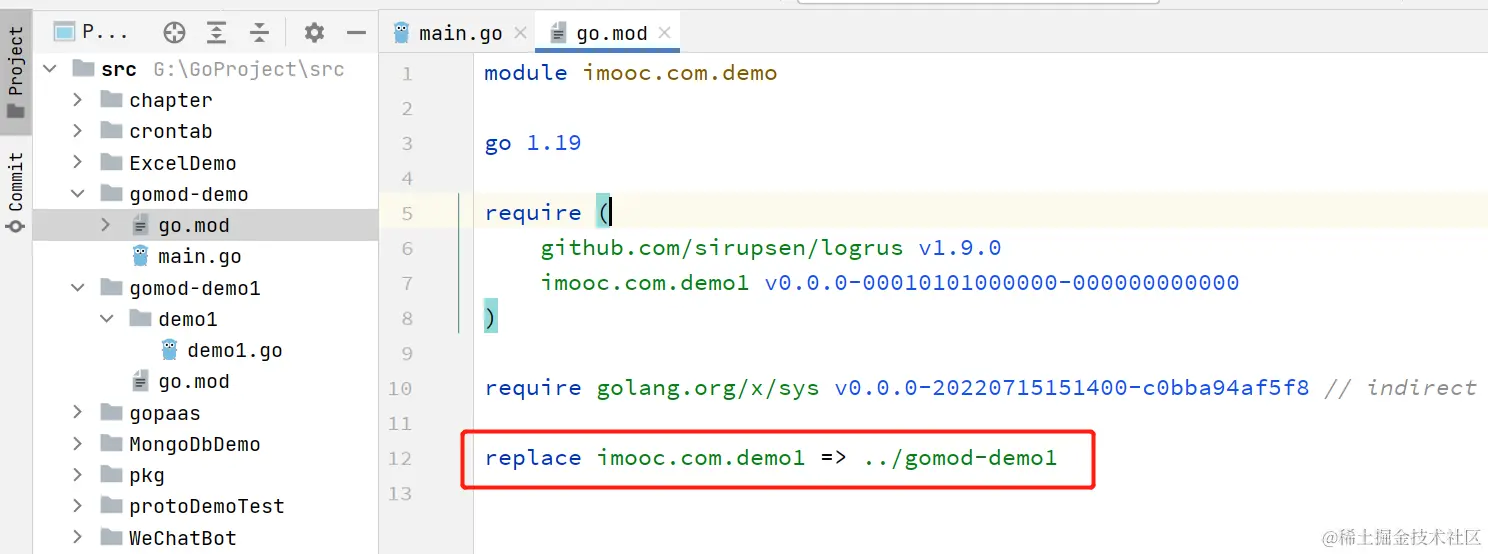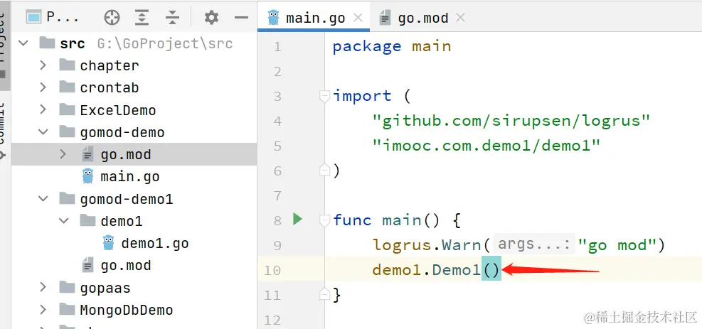 在gomod-demo项目中,引入gomod-demo1项目中的Demo1函数