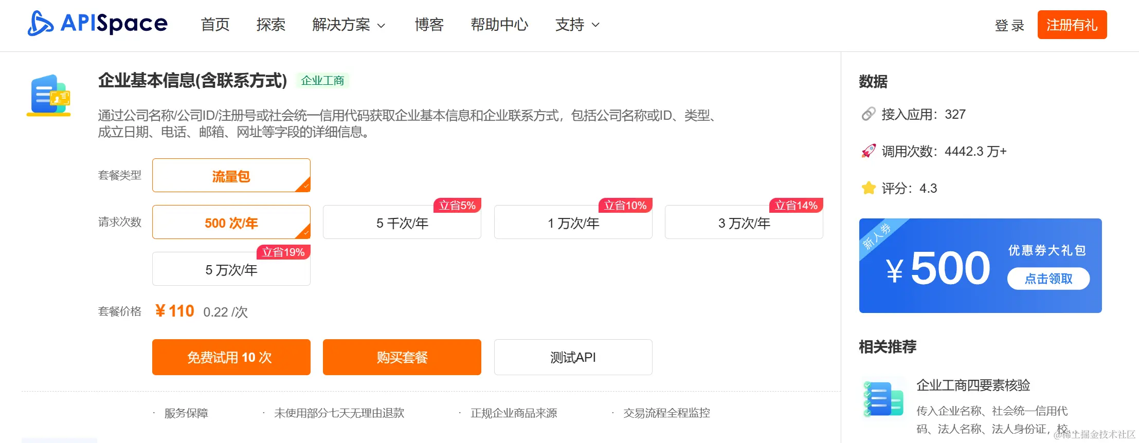 登录 APISpace,点击进入 企业基本信息(含联系方式) 的接口详情页,就可以申请接口了。