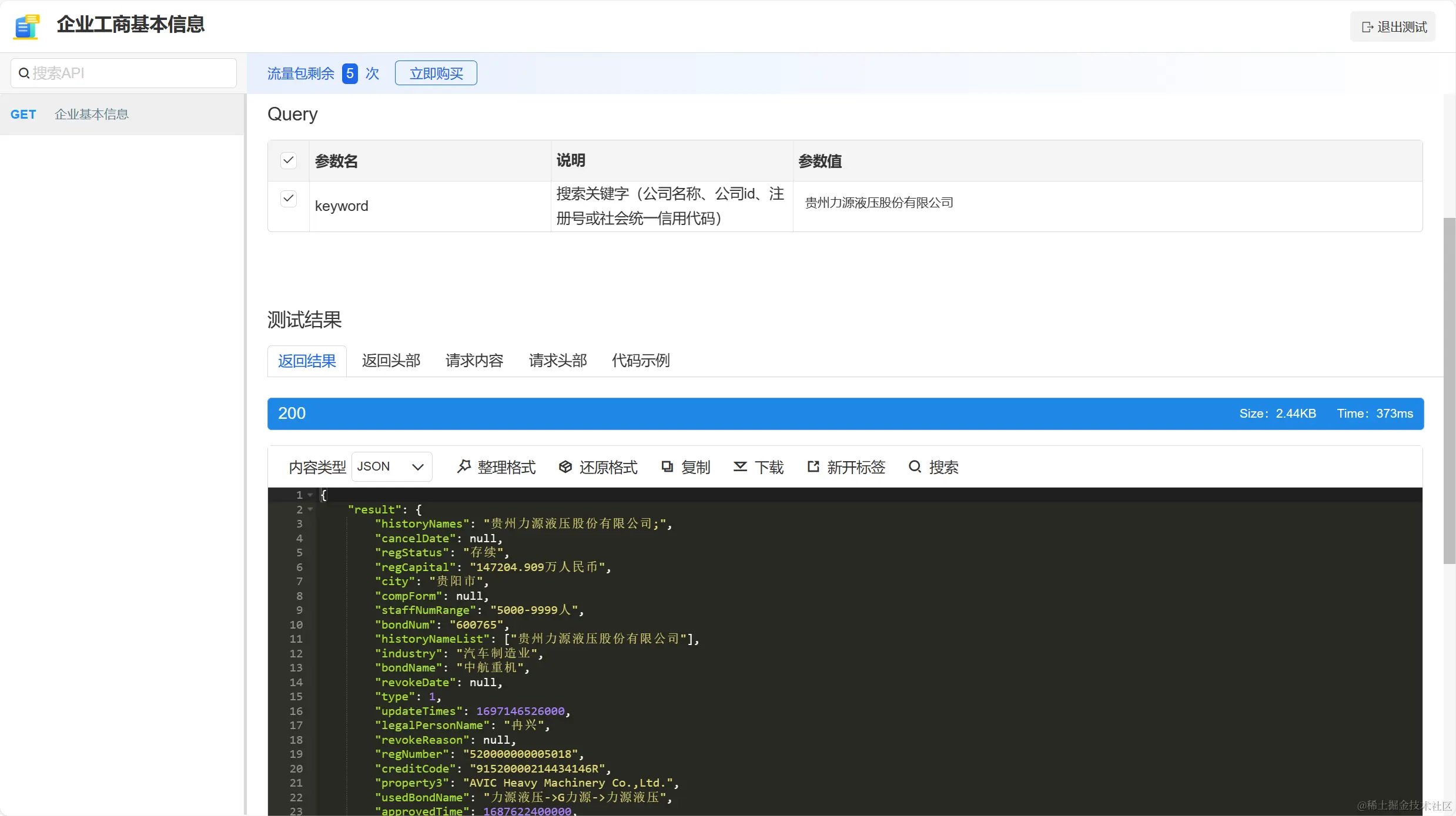 申请接口成功,进入测试页面,输入要查询的企业快速在线测试。测试成功,数据验证通过就可以将API接入到自己应用程序当中了。