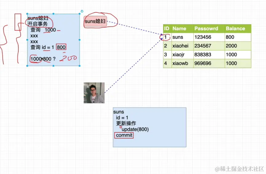 也就是suns媳妇开启了事务操作那一行数据的时候,suns去操作那行数据,就得登suns媳妇提交事务才能去操作,这样suns媳妇拿到的数据就会是一致的