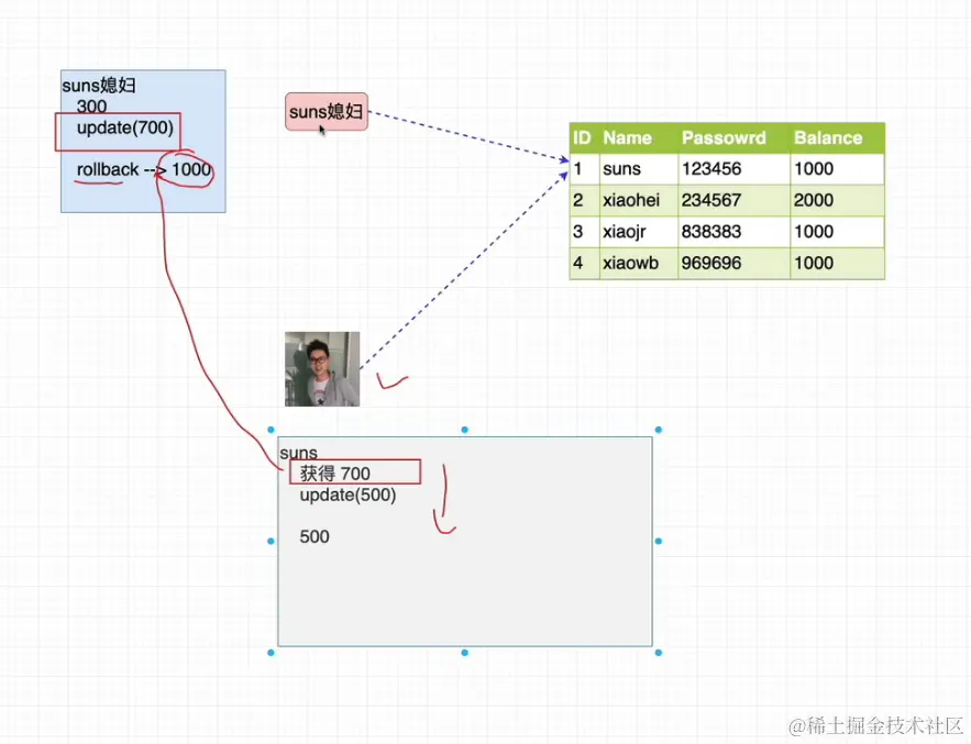 账户本来有1000块,suns媳妇先去取了700,但没提交,这时候suns取取钱,发现里面是700,取了 200,但suns媳妇最后回滚了,suns取钱提交了,这时候账户就只剩500了,少了300块钱。这就是