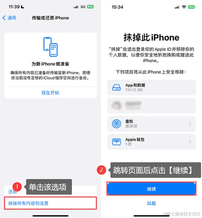 步骤2:在通用页面中下拉点击【传输或还原iPhone】,紧接着选择【抹掉所有内容和设置】选项,然后根据提示输入密码,抹除后等待手机重启即可。