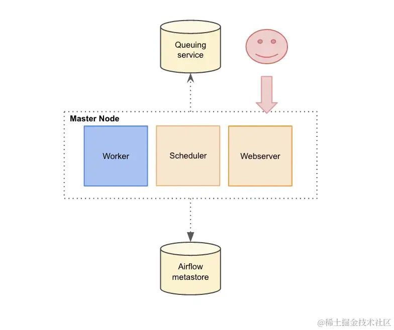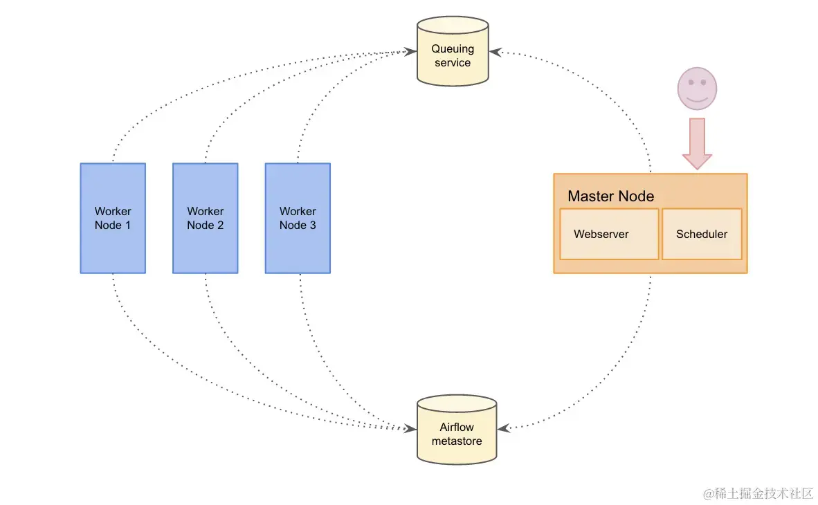 Airflow最早是由Airbnb开发然后贡献到Apache中的一个调度系统,目前使用较多,社区也比较活跃。用户可以通过Python定义工作流以及调度频率等。Airflow 定位是一个通用的调度系统,支持单节点以及多节点部署。整体架构图如下
