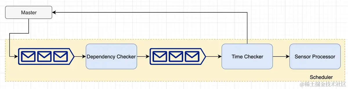 - 从队列(DelayedQueue)中取出通过依赖检查且到达运行时间的事件(实例)。如果是普通任务类型交由master去分发执行,如果是Sensor探针类型的任务则会丢到Sensor Processor去检查外部数据的就绪情况