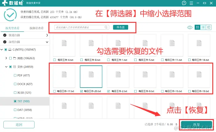 第4步:软件执行完深度扫描操作后,由于所呈现的文件过多,建议用户在 【筛选器】 中对文件进行条件限定,可以缩小文件的选择范围;