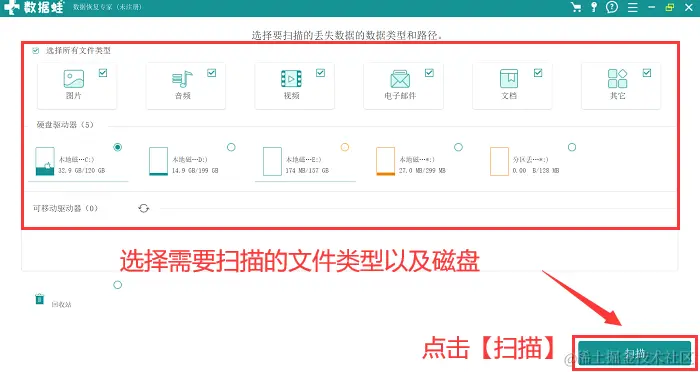 第2步:选择需要进行扫描和恢复的文件类型(误删文件的类型),并选择需要扫描的磁盘(误删文件所保存的磁盘),执行【扫描】;