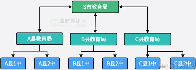 **例如:**高等级单位可以见下级单位,下级单位不可见高级单位。下图示例(箭头表示可见方向属性),那么市教育局和县教育局互相可见,教育局可见自己所属的学校,但学校之间互相不可见,也不可见上级单位。
