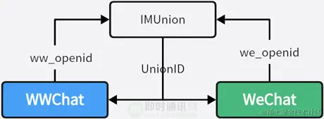 微信是距离企业微信最近的全民 IM 系统,通过 IMUnion,能够实现企业微信(WWChat)与微信(WeChat)用户关系链 ID 系统的映射,通过生成通用的公共 openid 关联彼此。