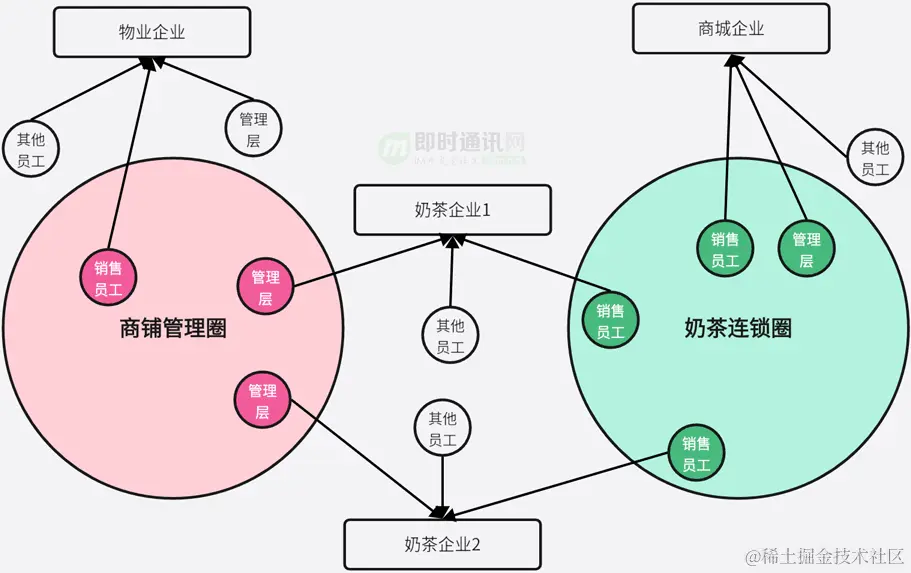 **企业微信创建了一个圈子的概念:**在同一个圈子中的员工,拥有相同的属性,例如互相可见,互相可通信,用以实现互联企业。