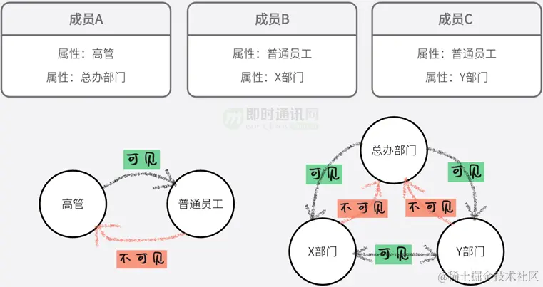 **其实:**用一维关系链也是可以模仿该结构,就是把全企业的人默认全部互为好友,也会拥有类似效果,但这样做无疑就太复杂了一些,不如用抽象的组织关系来替代者个关联关系。