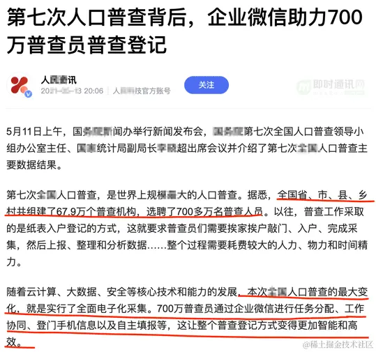 在最近一次的企业微信的大范围连接一切的尝试,是在 2020年的全国人口第七次普查中,企业微信的第四维关系链,就起到了关键性的作用。通过全国的省、市、县、街道的颗粒度,配置线下网格员,700万网格员全部在企业微信上,通过集团架构的模式层层关联,统一调度。然后再通过着700万普查员 与 14亿微信用户信息的链接实现了中央统一调度的效果。