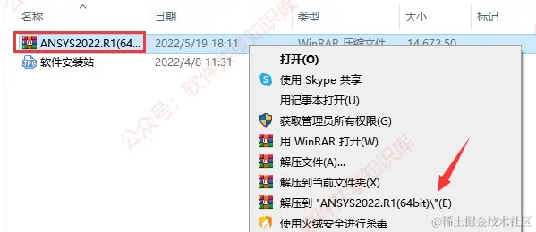 1.通过文章末尾处下载软件后,右键【ANSYS2022 R1(64bit)】选择【解压到ANSYS2022 R1(64bit)】。