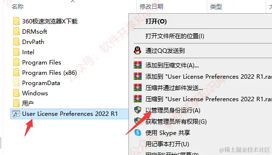 28.右键刚刚粘贴的【User License Preferences 2022 R1】文件选择以【以管理员身份运行】。