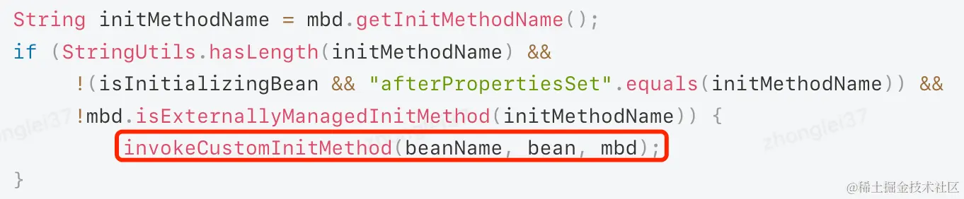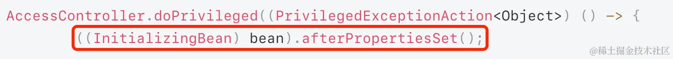在这个流程中,Spring框架会判断正在创建的Bean是否实现了InitializingBean接口,如果实现了就会调用afterPropertiesSet方法来执行代码逻辑。