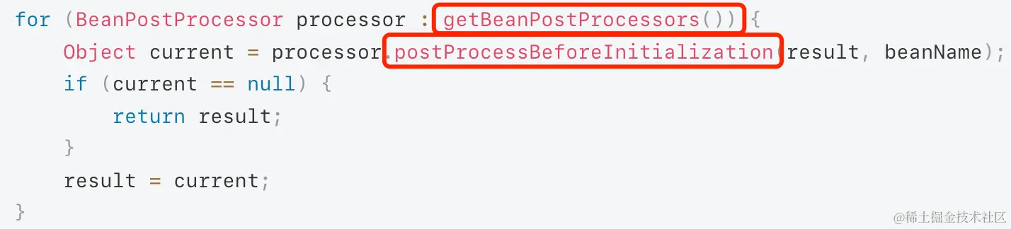 for (BeanPostProcessor bp : getBeanPostProcessors()) {