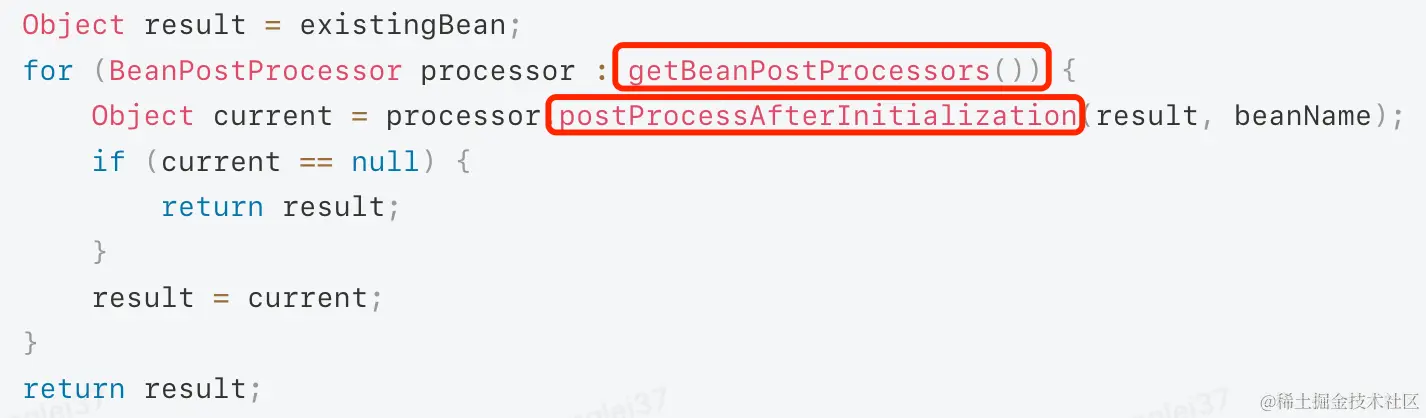 在这个方法中主要是获取Spring容器中所有实现了org.springframework.beans.factory.config.BeanPostProcessor接口的的实现类,然后循环调用postProcessAfterInitialization来加工正在创建的Bean