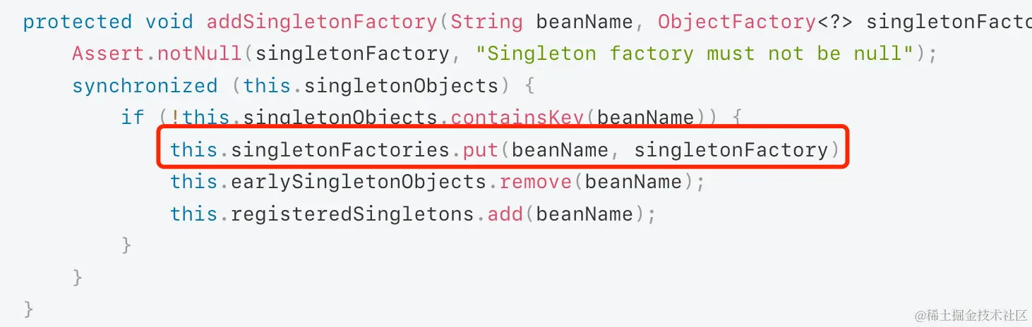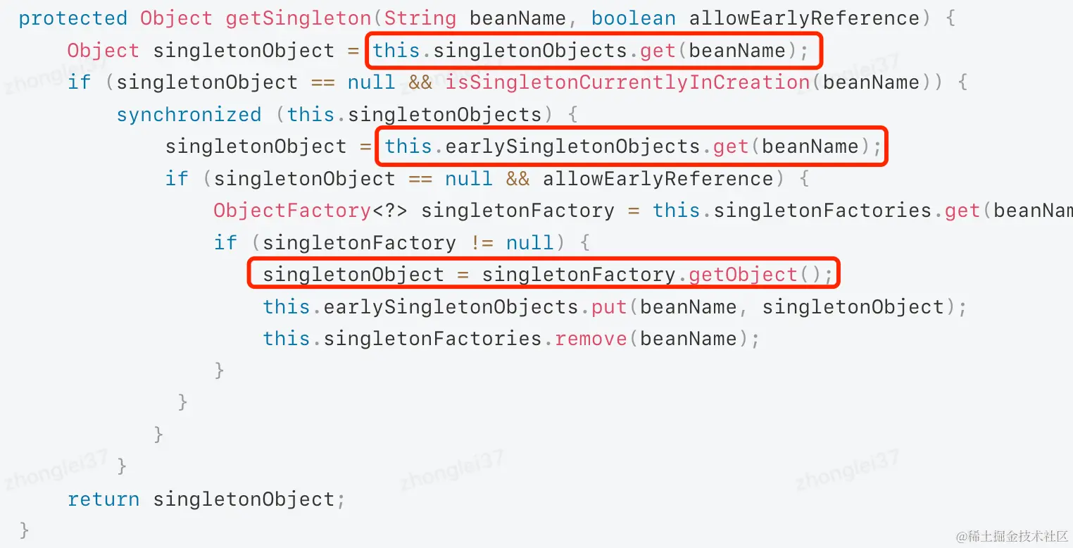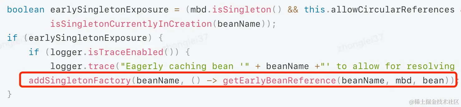 首先对于单实例类型的Bean来说,Spring在创建Bean的时候,会提前暴露一个钩子方法来获取这个正在创建中的Bean的地址引用,其代码如下: