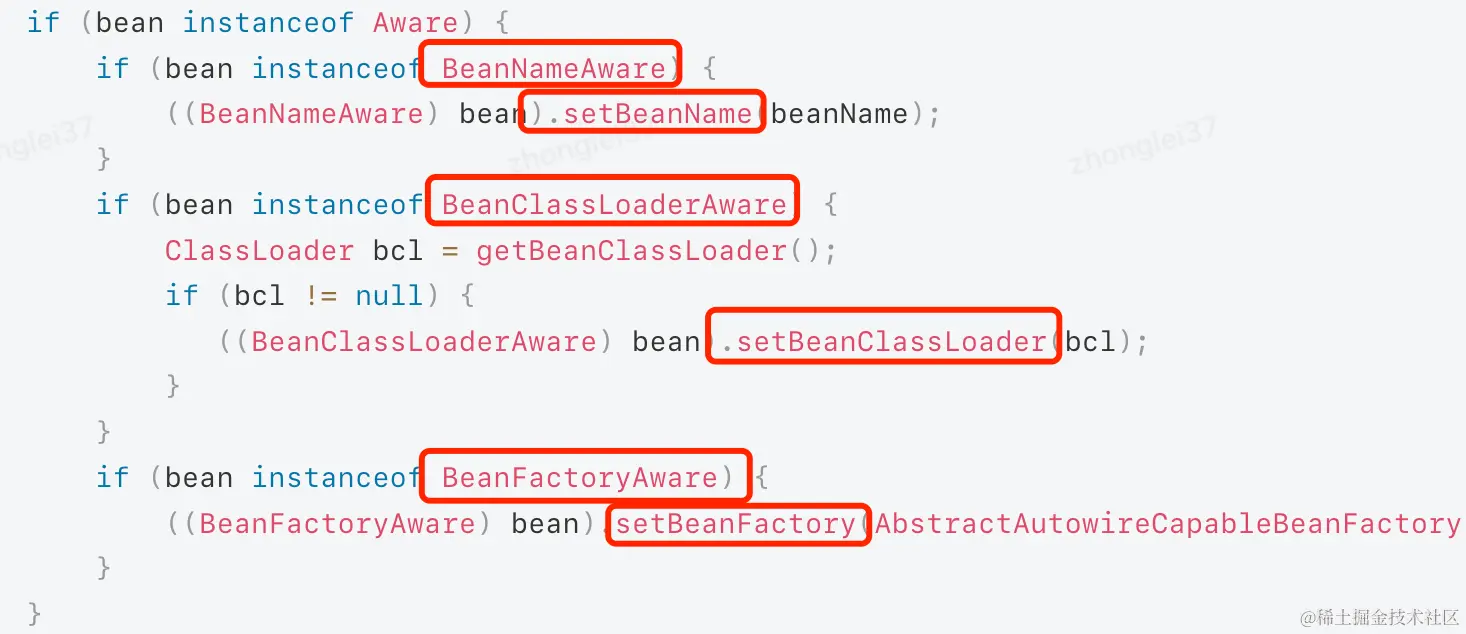 在这个方法中主要调用实现的Aware接口中的方法,包括了BeanNameAware.setBeanName,BeanClassLoaderAware.setBeanClassLoader,BeanFactoryAware.setBeanFactory,这三个方法
