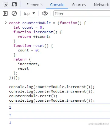 在上面的例子中,使用立即调用函数表达式(IIFE)创建了一个闭包,内部定义了count变量和两个操作它的函数increment和reset。通过返回一个包含这些函数的对象,实现了对count变量的封装和控制。