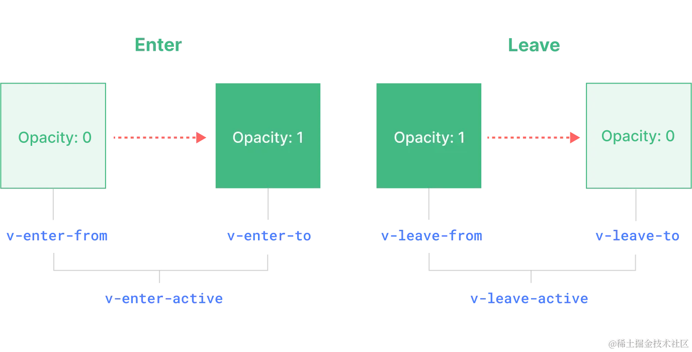 v-leave-from | 在离开过渡效果被触发时立即添加,在一帧后被移除。 | 离开动画的起始状态。 |