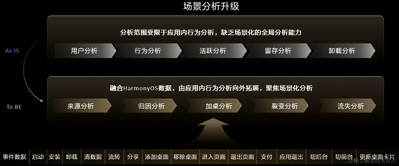 以前的分析能力不知道用户进入应用的路径,在鸿蒙生态下,华为会构建一个元服务的场景值ID,这个场景值就是描述用户进入元服务的路径,可以根据场景值去分析不同场景下的新增用户、活跃用户以及付费用户,从而优化引流的策略。