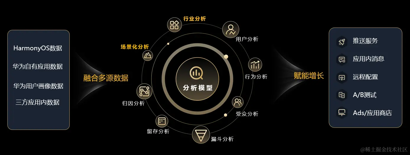 在鸿蒙生态上,华为会融合多端多源数据,包括HarmonyOS的系统级数据、华为自有的应用数据以及华为用户画像数据和应用内的数据,借助于这些多源的数据融合,构建用户全生命周期的分析能力,帮助实现精细化的运营和产品的优化,从而实现用户的增长。
