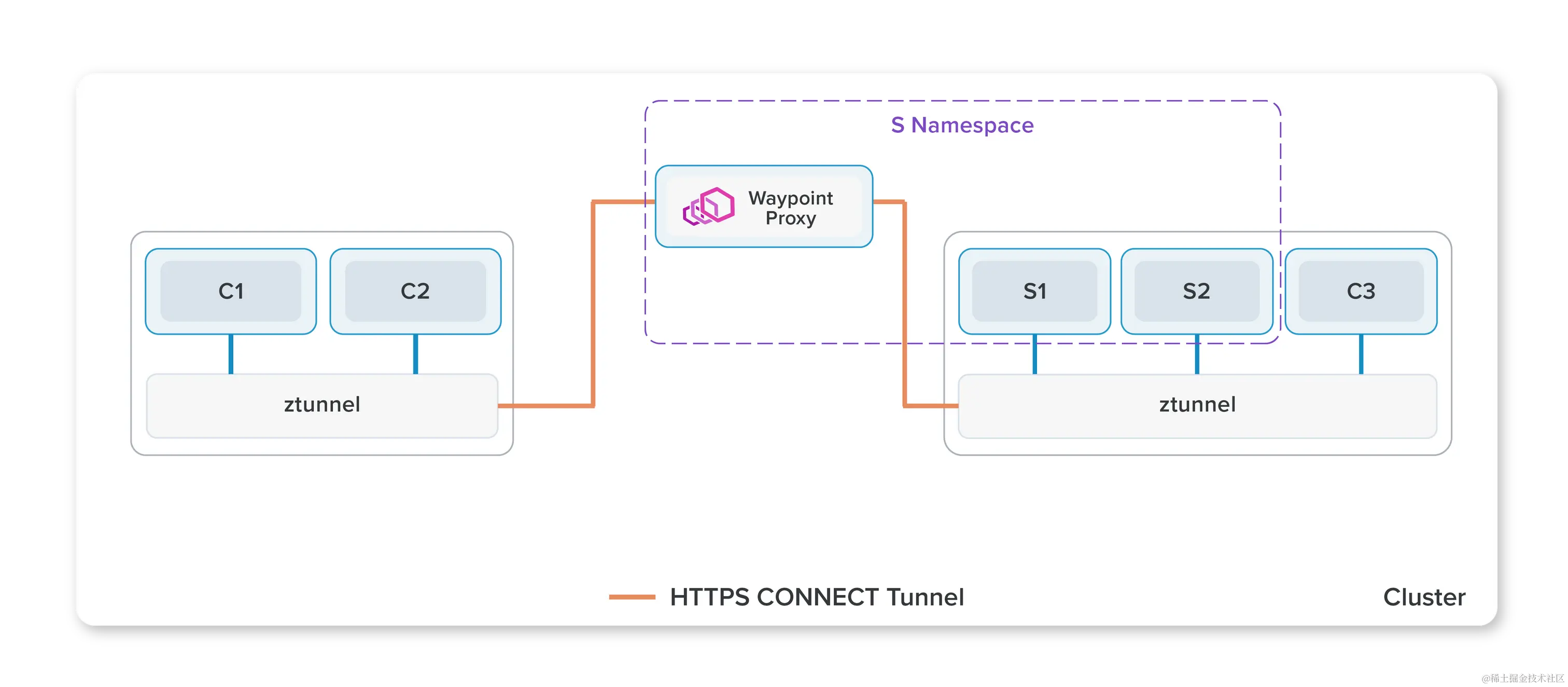 如下图所示,ztunnel 为安全覆盖层(L4),是运行在 Kubernetes 集群节点上的一个 处理 L4 层的共享代理。Waypoint Proxy 即是处理 L7 层,它是通过 Pod 的形式部署在 Kubernetes 集群中,可以自动扩缩。