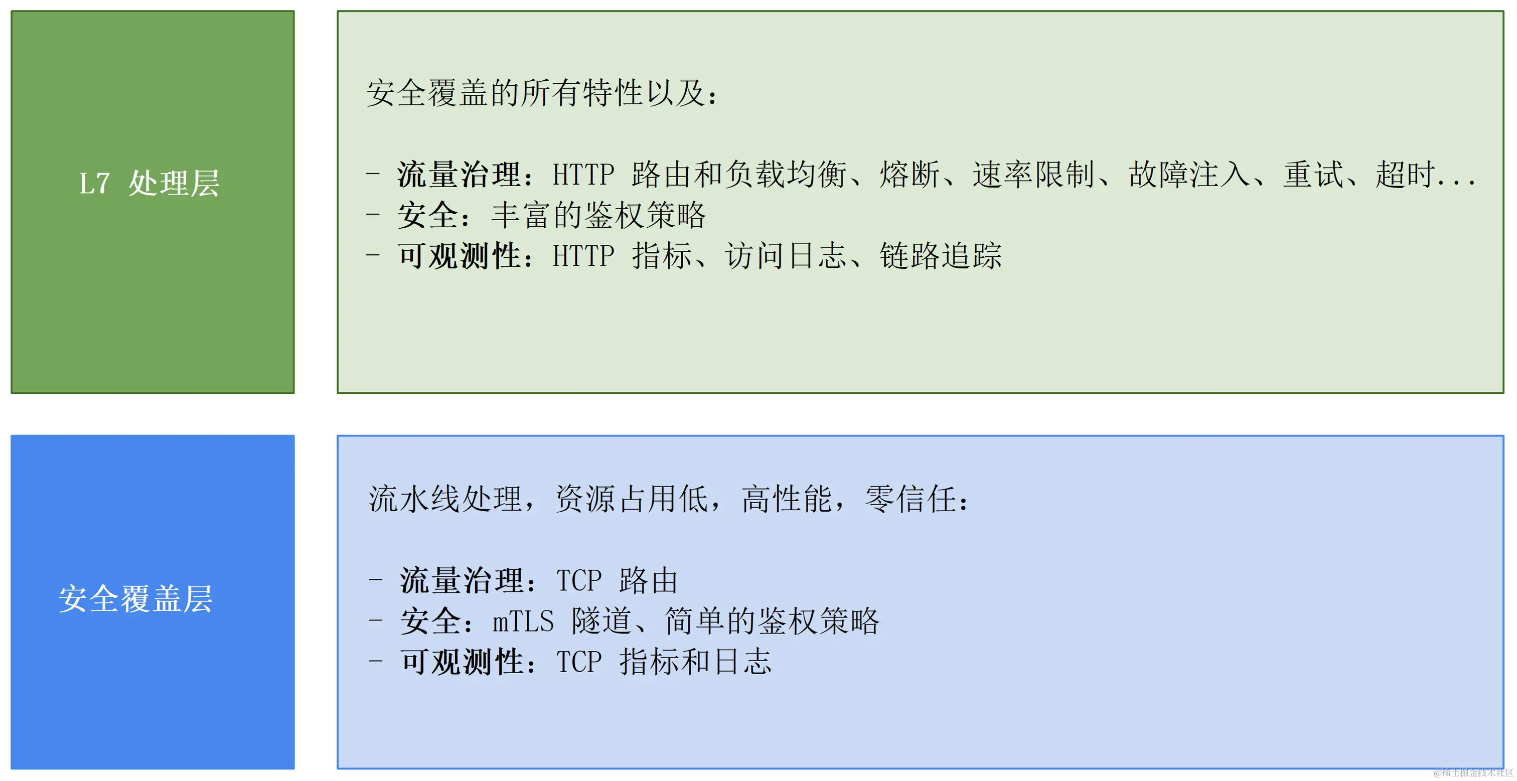 - 流量熔断:流量捕获和 HTTP 处理通常由 Istio 的 Sidecar 完成,计算成本较高,可能会因 HTTP 实现不合规而破坏一些应用。