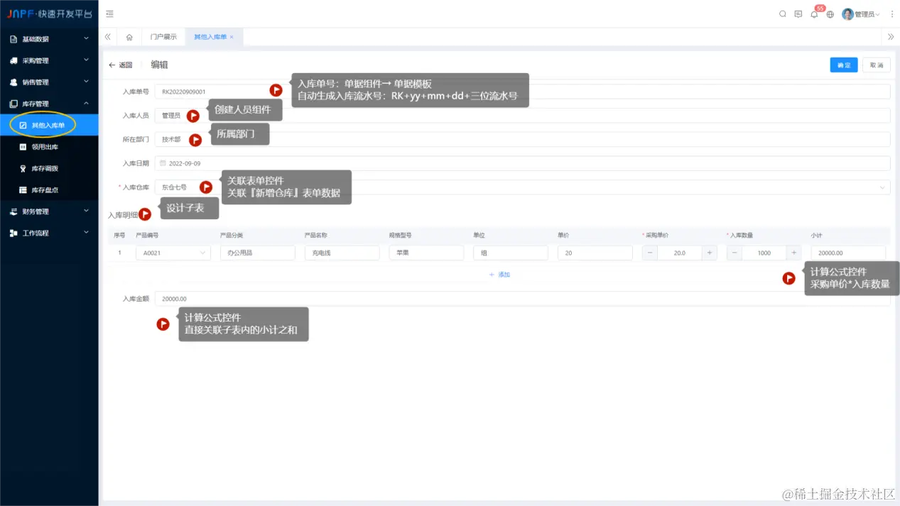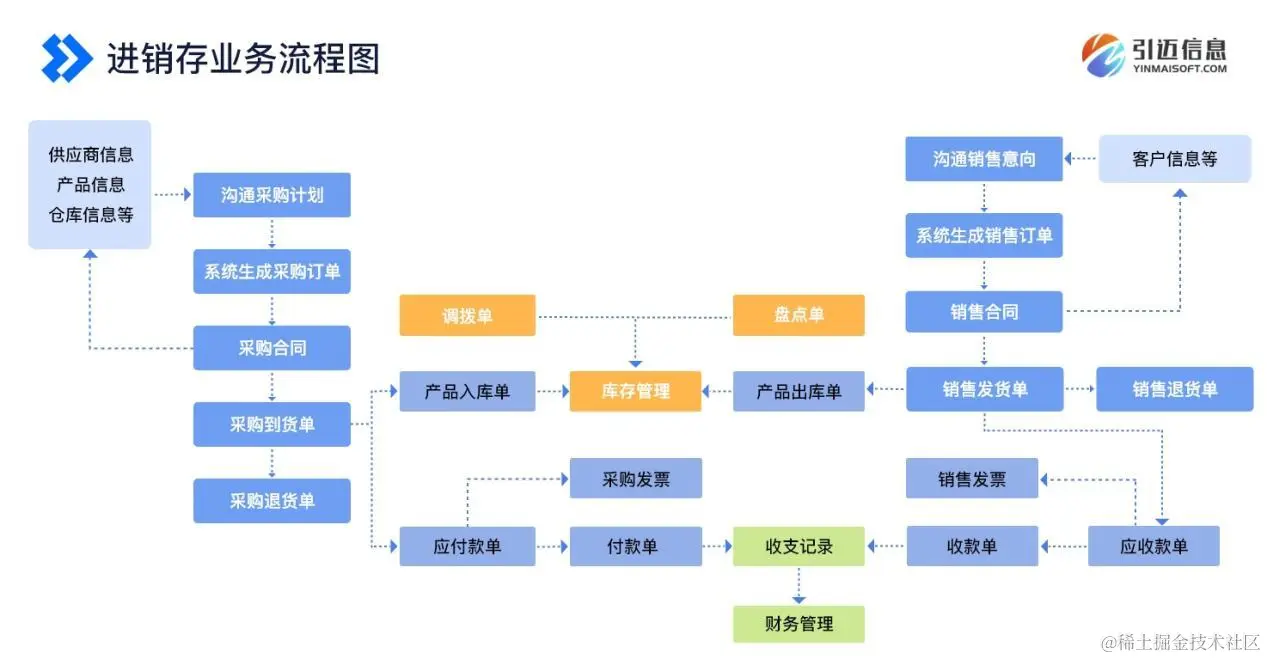 基于低代码平台(JNPF)搭建的进销业务流程图: