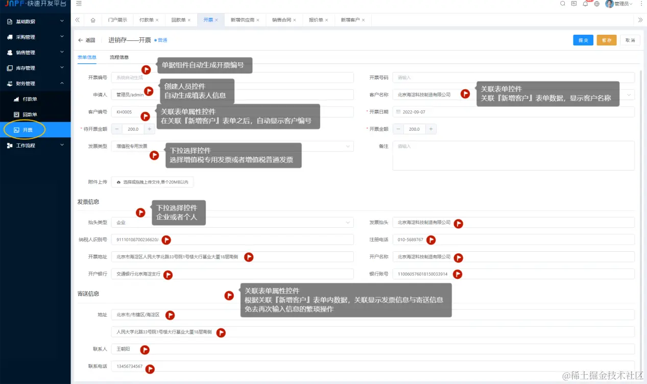 比如说在订单管理系统中,当一条订单被确认时,需要自动生成待支付账单和待发货单,同时锁定库存,向客户发送通知,在自动化工作流中,涉及到了5个实体数据的增删改查(订单、账单、发货单、库存、客户)。低代码平台需要提供一系列控件来满足这些需求。作为平台除了需要有强大的自定义流程控件支撑外,还需要支持其他平台的集成。
