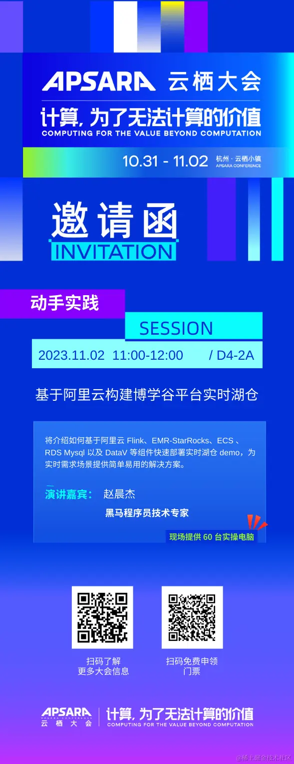 2023 云栖大会 | 「动手实践」基于阿里云构建博学谷平台实时湖仓 Flink_China 2023-10-26 89 阅读1分钟 传智教育技术专家将在云栖大会「动手实践」环节带领开发者基于阿里云构建博学谷平台实时湖仓。本实践介绍如何基于阿里云 Flink、EMR-StarRocks、ECS 、RDS Mysql 以及 DataV 等组件快速部署实时湖仓 demo,为实时需求场景提供简单易用的解决方案。 时间:2023-11-02 11:00~12:00 地址:杭州·云栖小镇 D4-2A 点击领取门票 点击领取门票