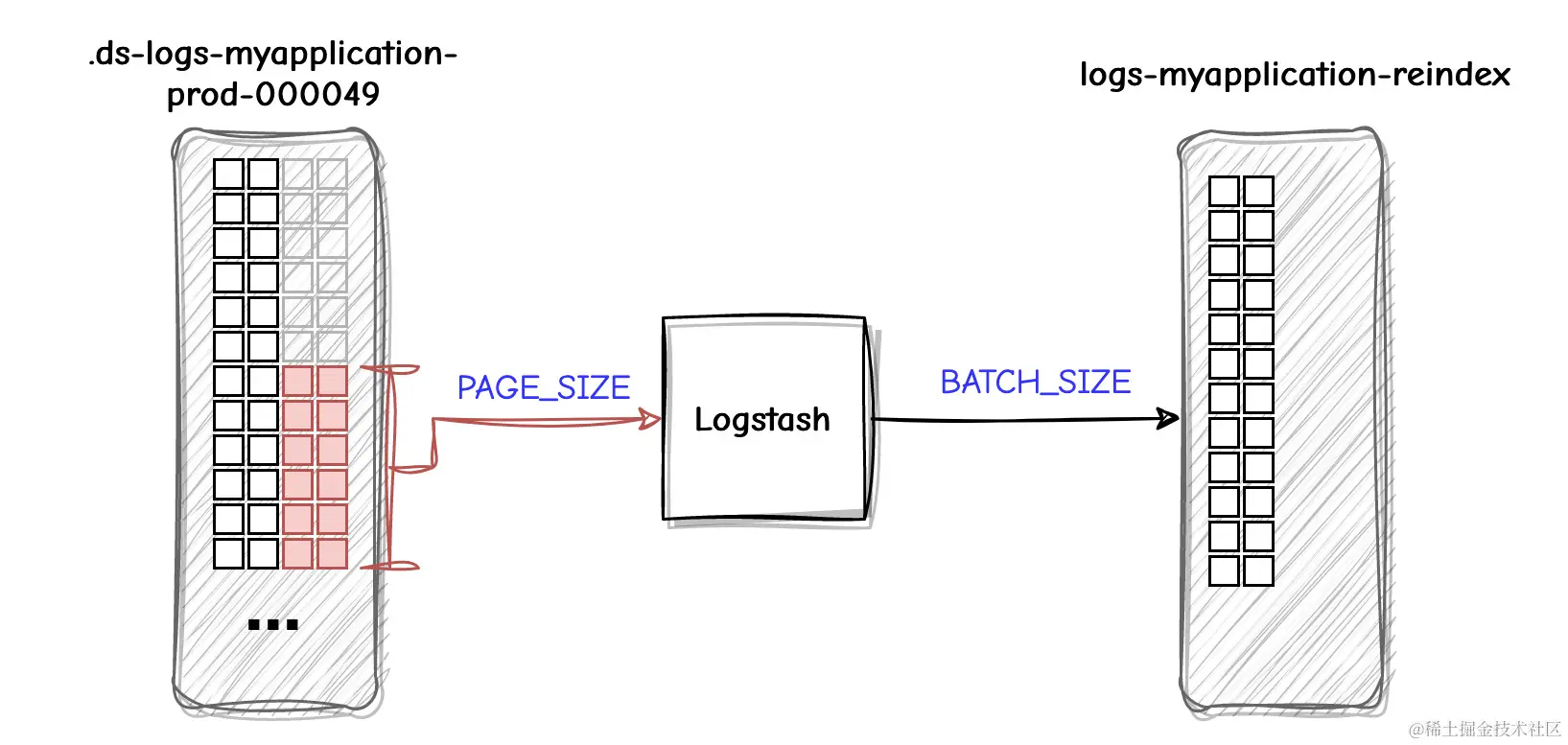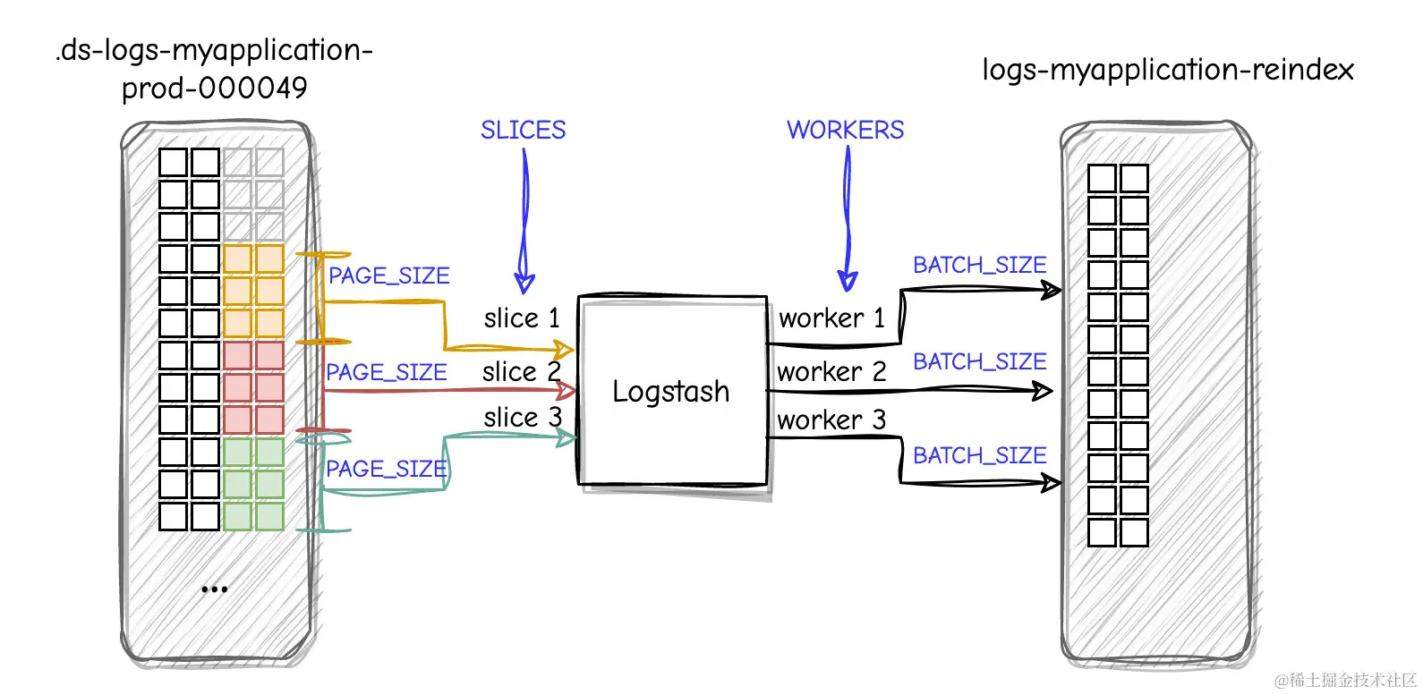 如果不进行优化,从 A 读取数据并写入 B 可能会很慢,因为它涉及对结果进行分页、通过网络将每个批次传输到 Logstash,Logstash 将在另一批次中组装文档,然后再次通过网络将这些批次传输到 Elasticsearch(文档将被索引的位置)。 因此,当涉及到如此大的数据集时,我们必须非常高效,并尽可能地提取每一点性能。