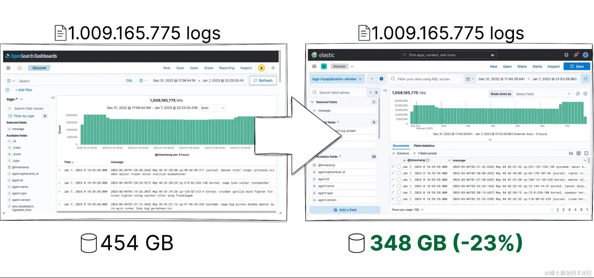 | .ds-logs-myapplication-prod-000042 | 113859174 | 26686723701 | logs-myapplication-reindex-000042 | 113859174 | 21093766108 | 23.41% |