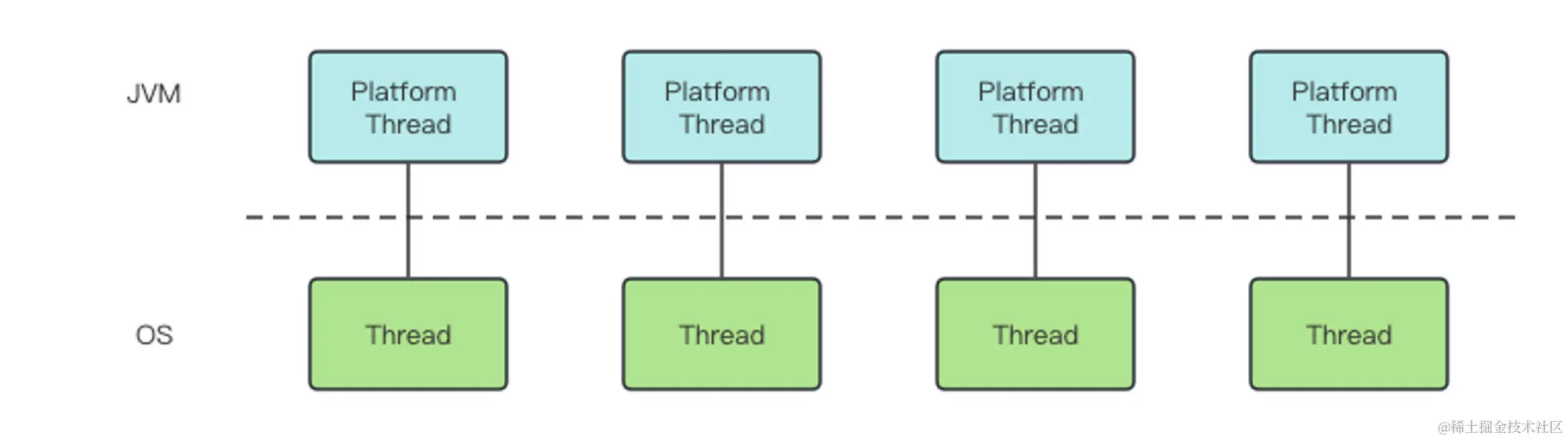 在平时的开发过程中,我们所使用的多线程往往意味着平台线程。平台线程代表着JVM直接与操作系统交互,创建了一个一个的线程,并且在JVM中还要为这个线程单独开辟内存使用。一般在JVM中创建一个平台线程,开销大约在1M左右。为了避免创建线程和销毁线程带来的巨大开销,我们通常选择使用池化技术来维护一些活跃的线程。