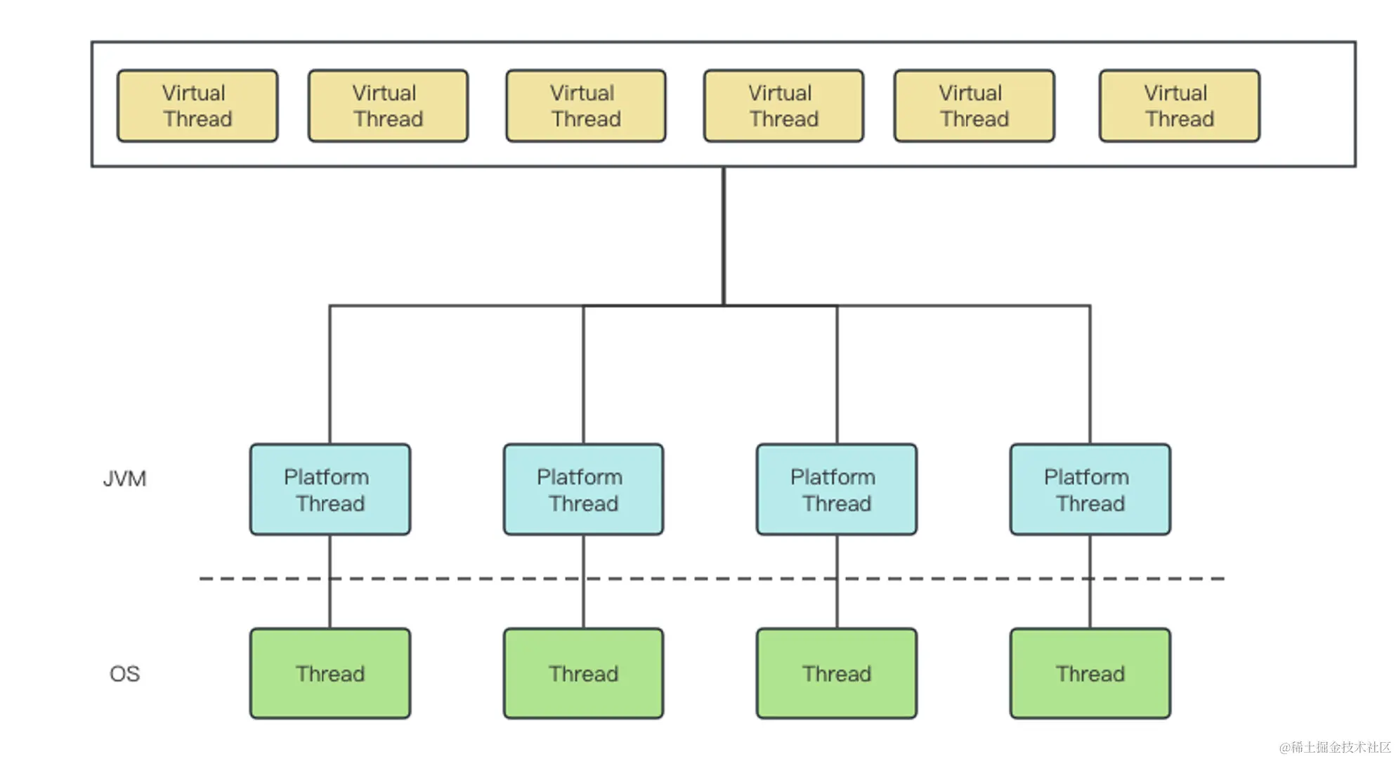 虽然图中只画了几个虚拟线程,但是在实际使用中,我们可以创建成百上千的虚拟线程而不用担心资源消耗的问题