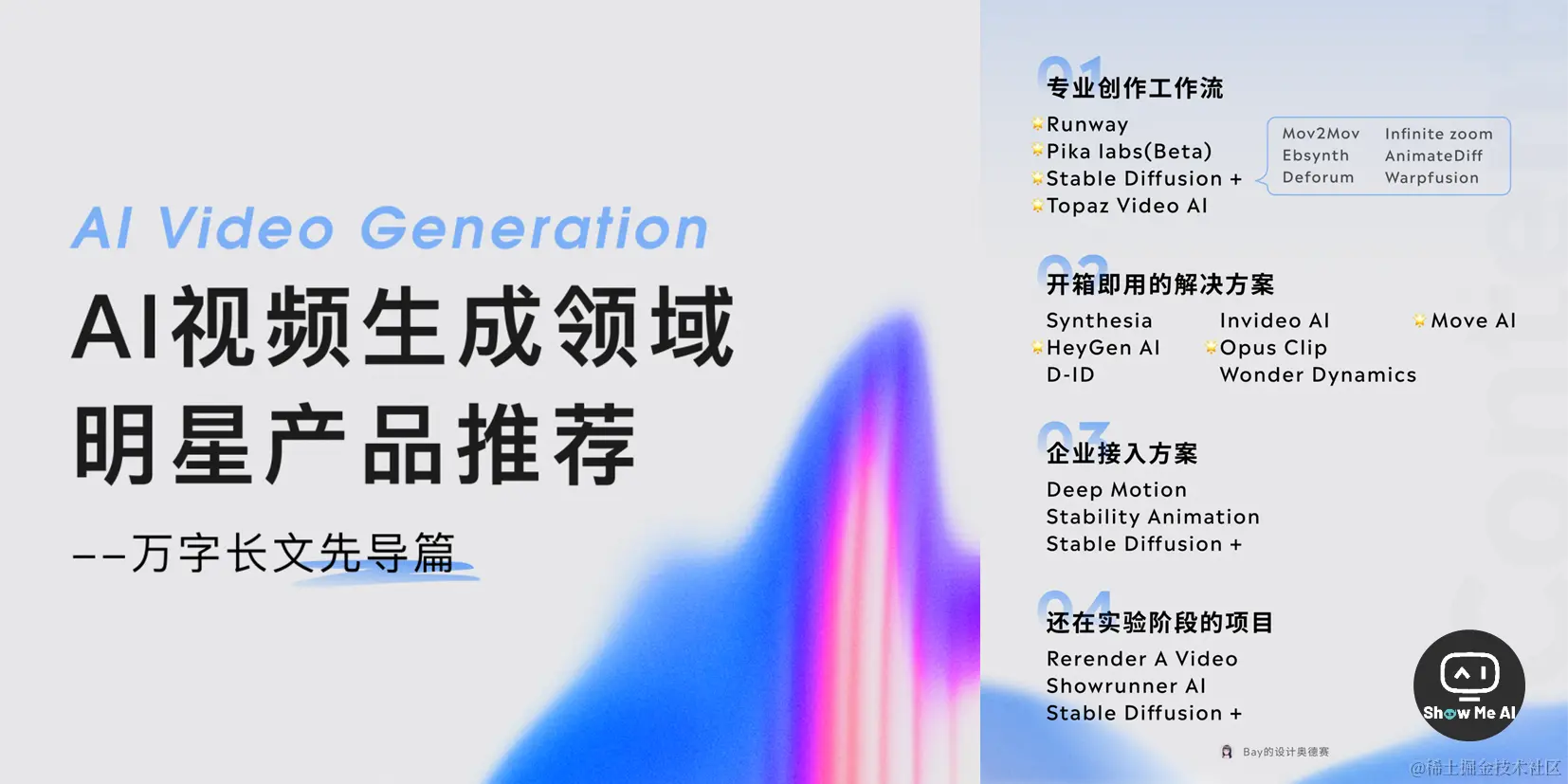 这是 ShowMeAI 一直在追的系列,主题是「AI视频生成的技术原理&产品教程」。作者用上中下三篇文章,详细介绍了视频生成领域的技术发展路径、四大类产品解决方案、各个工具的操作指南。