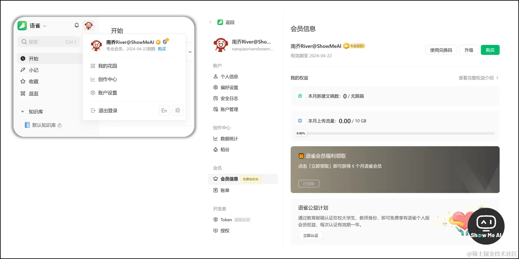 我用小号注册登录了一下,非会员用户也可以领到!访问上方链接,或者点击「头像 - 账户设置 - 会员信息 - 语雀会员福利 - 立即领取」 ⋙ 语雀故障公告