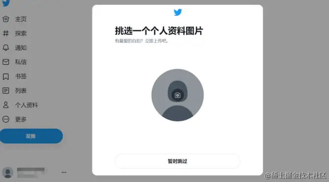 看到下图,已经完成Twitter账号注册,最后会弹出询问你是否上传头像,如果暂不需要,可以直接选择跳过。