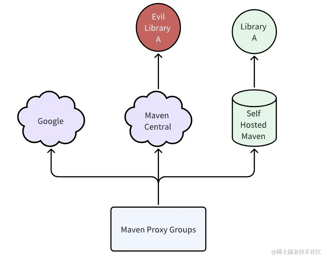 在Android应用开发中,主流的依赖管理系统由Gradle和Maven组成。单个Maven组件由group、artifact、version唯一标识,即GAV,例如com.google.android.gms:play-services-ads:22.4.0。实际项目中,开发人员可以引用任意Maven源,但他们通常使用几个主要的公开源,如Google和Maven Central。另一方面,在较大的组织中,总会存在一些私有Maven源用于托管自研组件。有时组织内部也会存在Maven源代理组(proxy group),方便开发人员通过一次引用使用多个源。