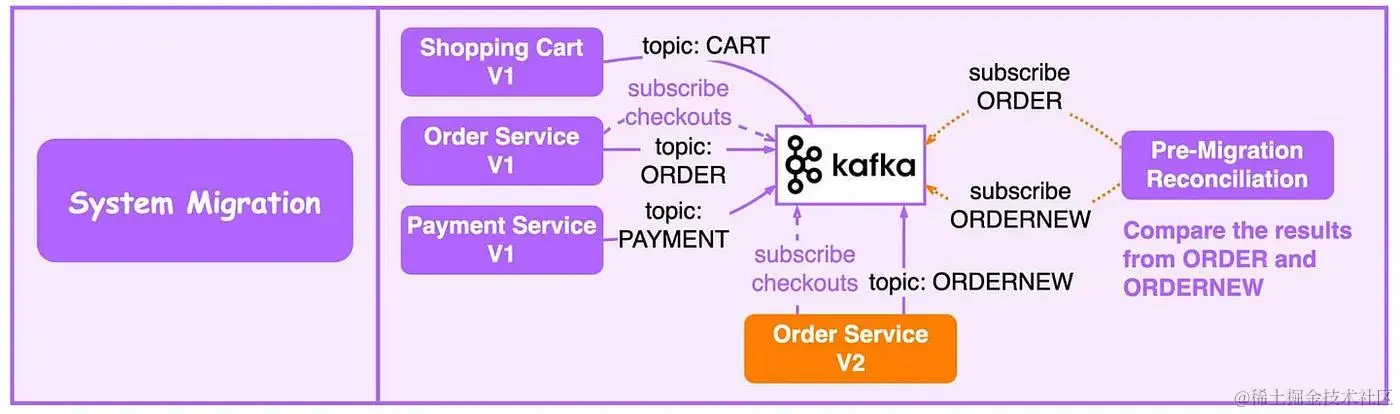 - 在下图中,为了升级下图中的订单服务,我们更新旧的订单服务以使用来自 Kafka 的输入并将结果写入 ORDER 主题。新订单服务使用相同的输入并将结果写入 ORDERNEW 主题。