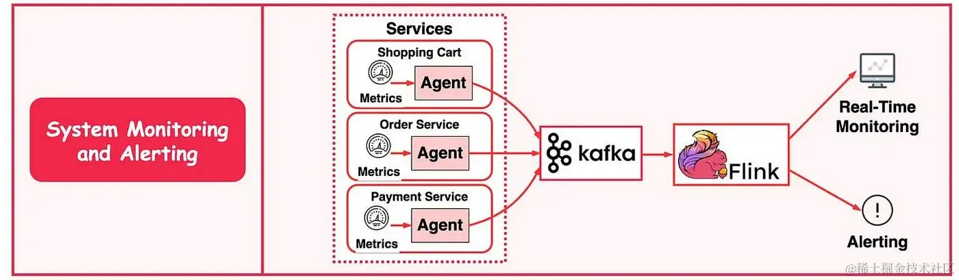 - 区别在于指标是结构化数据,而日志是非结构化文本。指标数据发送到 Kafka 并在 Flink 中聚合。聚合数据由实时监控仪表板和警报系统使用。