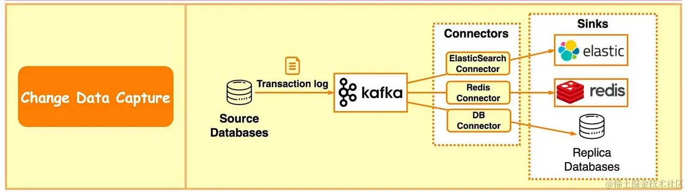 - 更改数据捕获 (CDC) 将数据库更改流式传输到其他系统以进行复制或缓存/索引更新。