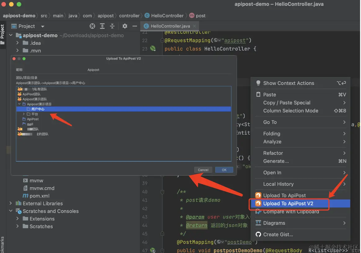 相比较之前版本,V2版本同步API时支持选择当前用户所处的团队、项目、项目中的目录